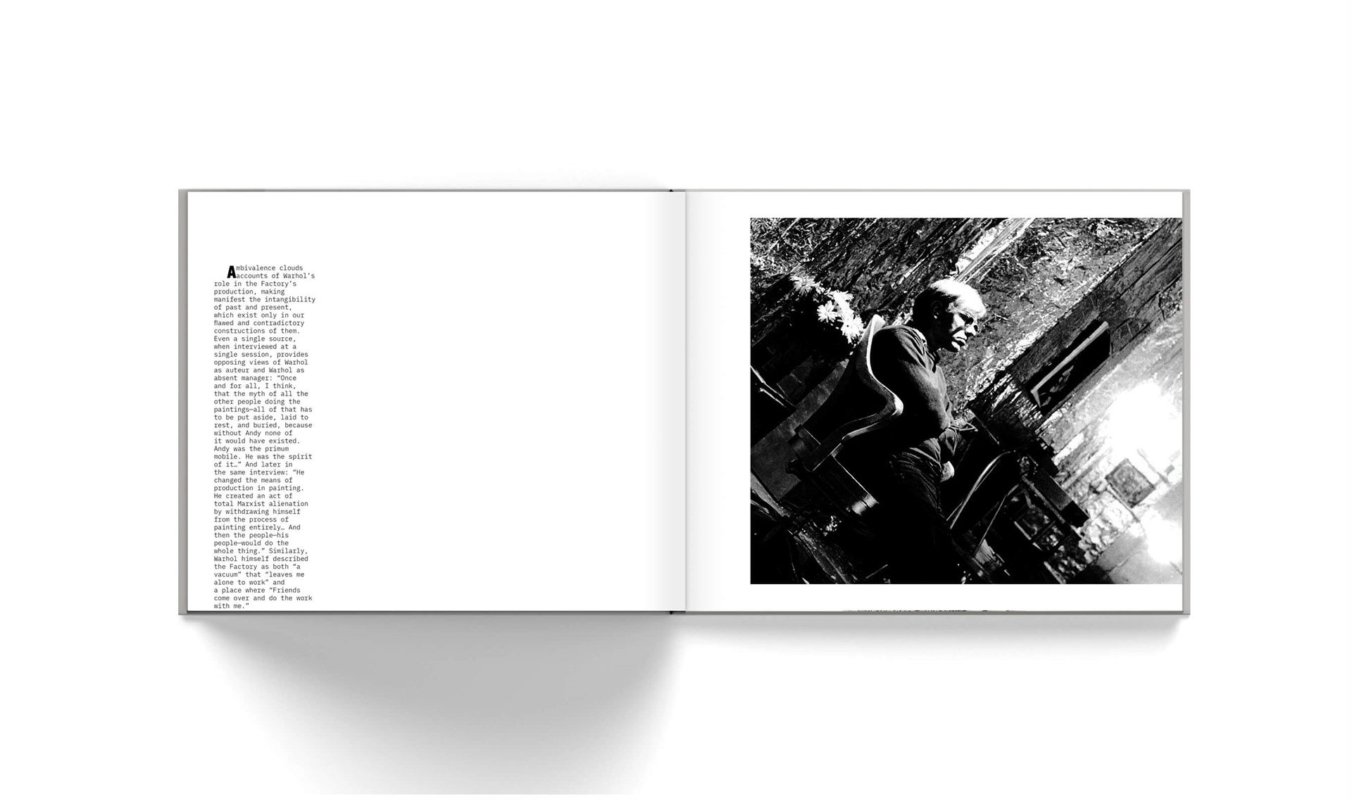 A significant portion of this book was screen-printed by hand to underscore the mechanics of Warhol's artistic process. Images of The Factory and its Superstars were printed in translucent silver ink, overlapping photographs of twentieth-century factories and their workers. Xerox-manipulated typography was also printed on silver stock throughout.