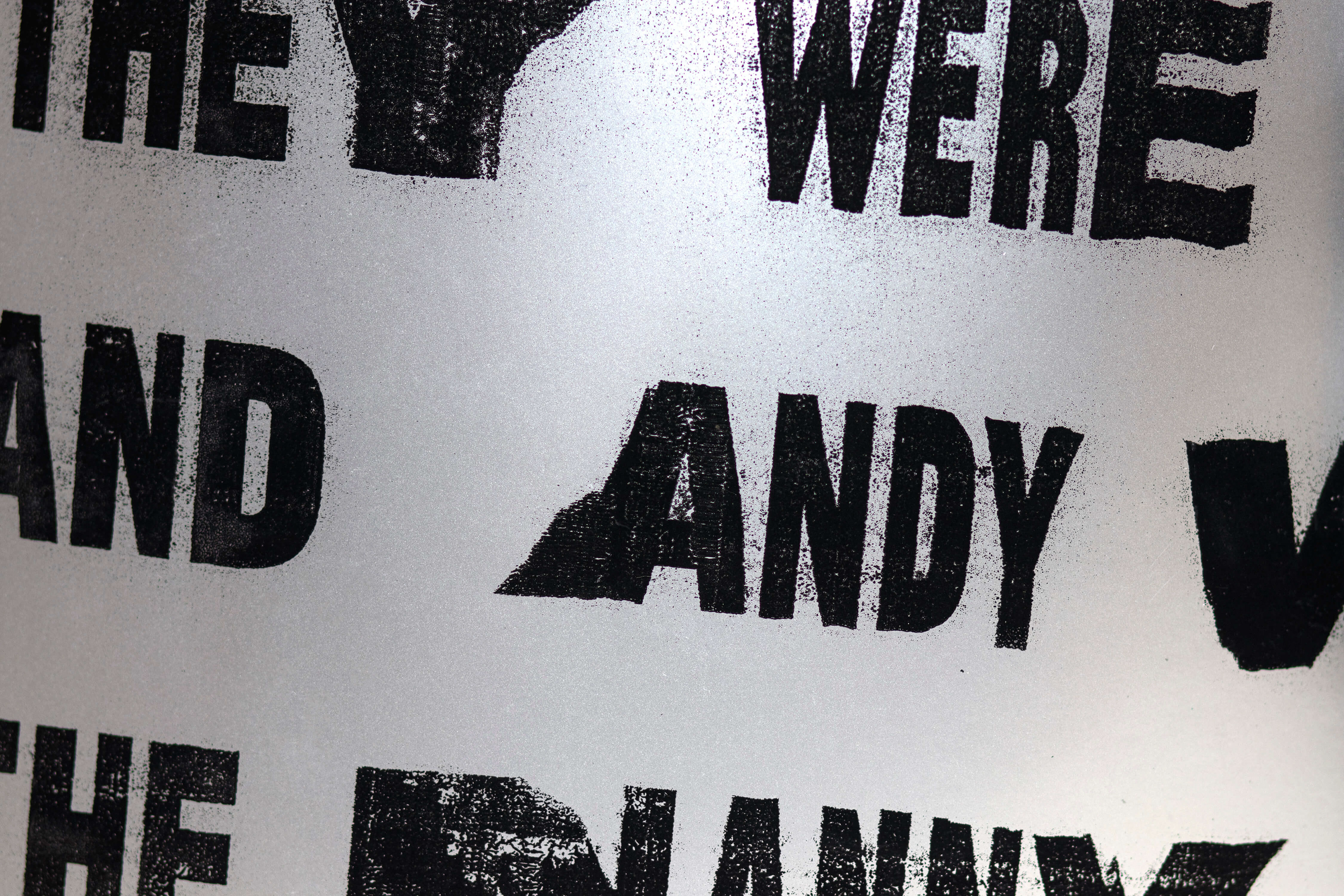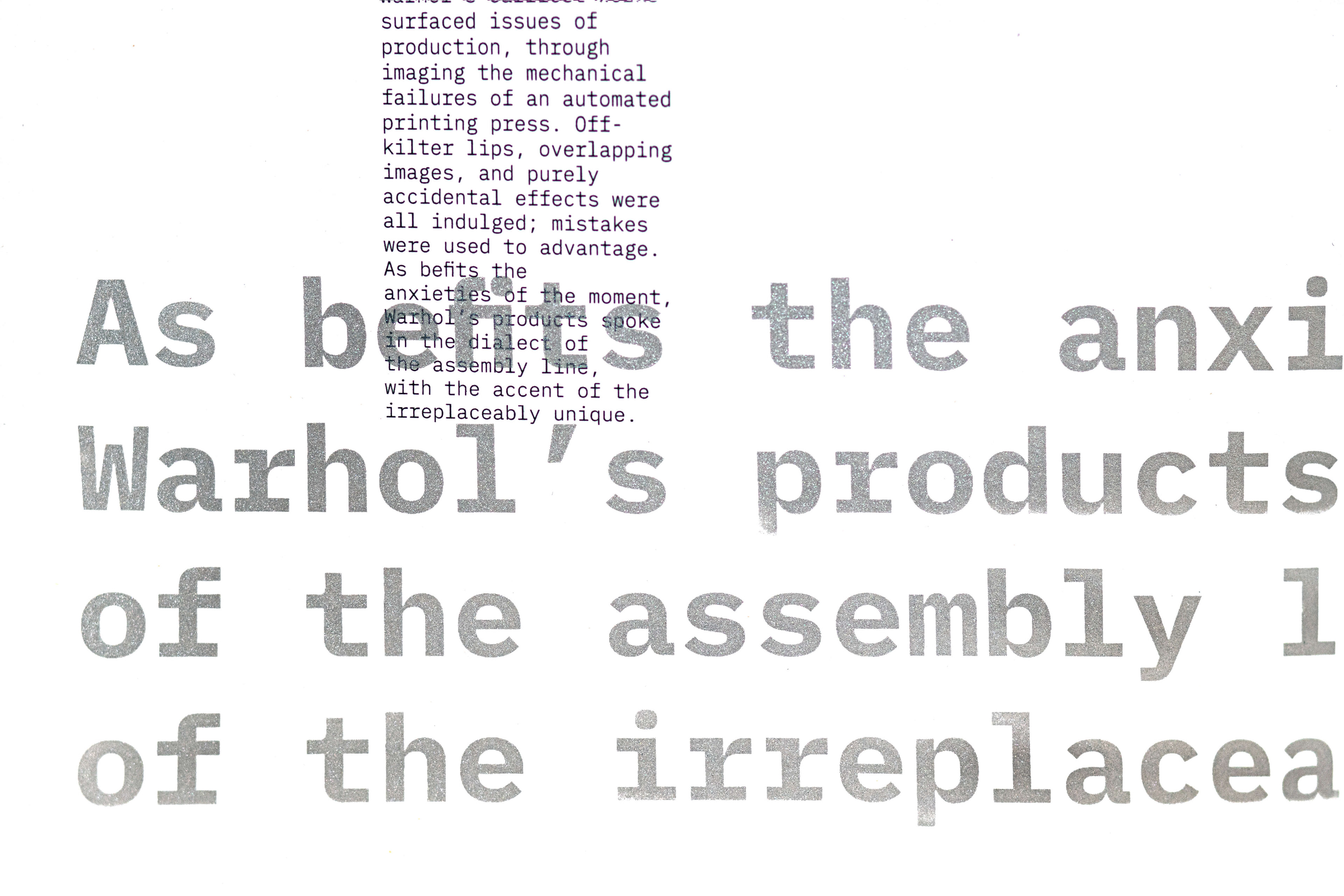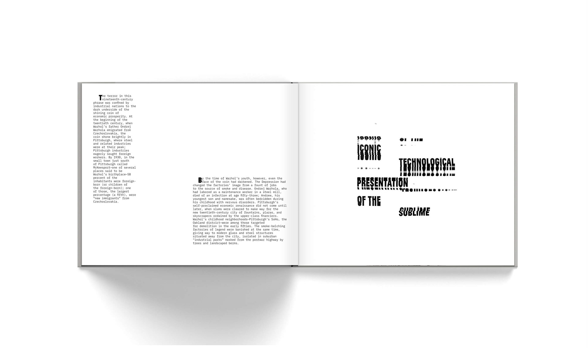 The typefaces used throughout this book reference the IBM Selectric typewriters used in the Factory for transcribing tapes. The electrophotographic and digitally manipulated typography serves as a nod to Warhol's Xerox Progressions and his connection to hand lettering as a commercial artist.