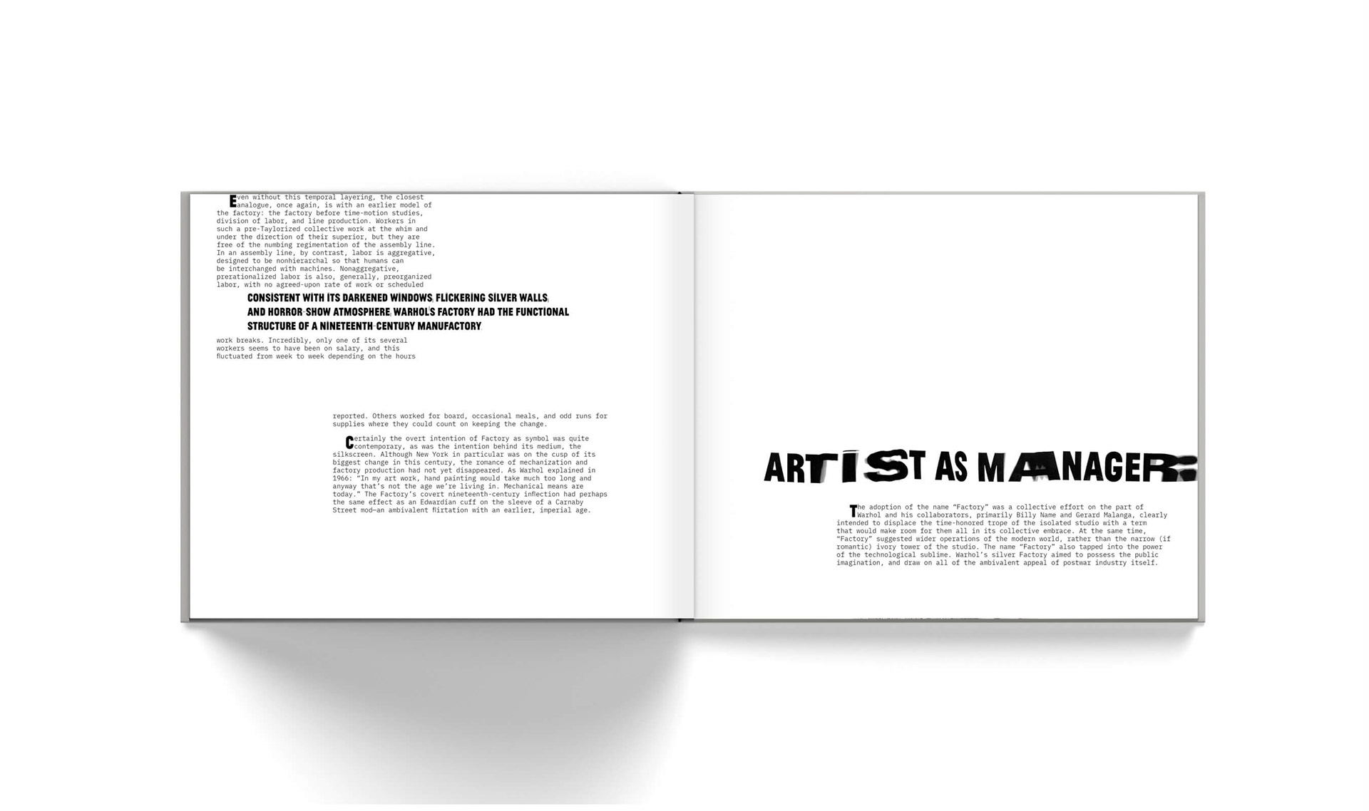 Silver Was the Future: The Mechanics of Andy Warhol’s Factory is a visual translation of Caroline Jones’ research comparing Warhol’s Factory to a traditional factory. The physical location and the symbolic name of Warhol's studio were representative of a shift in what it meant to be an artist in America. Warhol's work was characterized by consumerism, in terms of both process and subject matter, and removal of the artist's hand. The visual language focuses on industrialism and mass production, with a bookbinding method that references Fortunato Depero’s Bolted Book and Knoll Group’s Knoll Celebrates 75 years of Bauhaus Design.